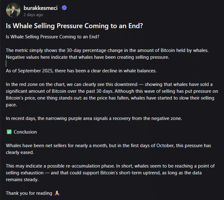 “Les indicateurs montrent un épuisement progressif des ventes. Les baleines prennent une pause après un mois de dégagements importants,” Burak Kesmeci un analyste on-chain.