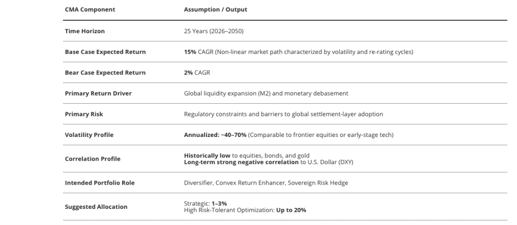 Même les auteurs encadrent l’exercice par des scénarios alternatifs, dont un cas « bear » à 130 000 $ en 2050. Le modèle reconnaît explicitement que le principal risque n’est pas seulement technologique, mais aussi politique : des contraintes réglementaires et des barrières à l’adoption comme couche de règlement mondiale pourraient empêcher la thèse de se matérialiser. Toutefois, cela semble très peu probable au regard de la dynamique politique actuelle et l’adoption progressive par de nombreux pays.