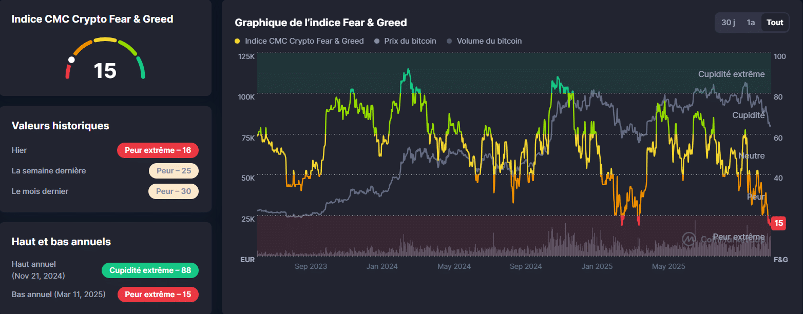 L’indice Fear & Greed tombe à 15, un niveau rarement atteint depuis le printemps. Ce score montre un marché en retrait, où les investisseurs préfèrent réduire les risques. Dans ce contexte, la dominance du Bitcoin grimpe à 58,56 %, ce qui confirme son rôle de valeur refuge.