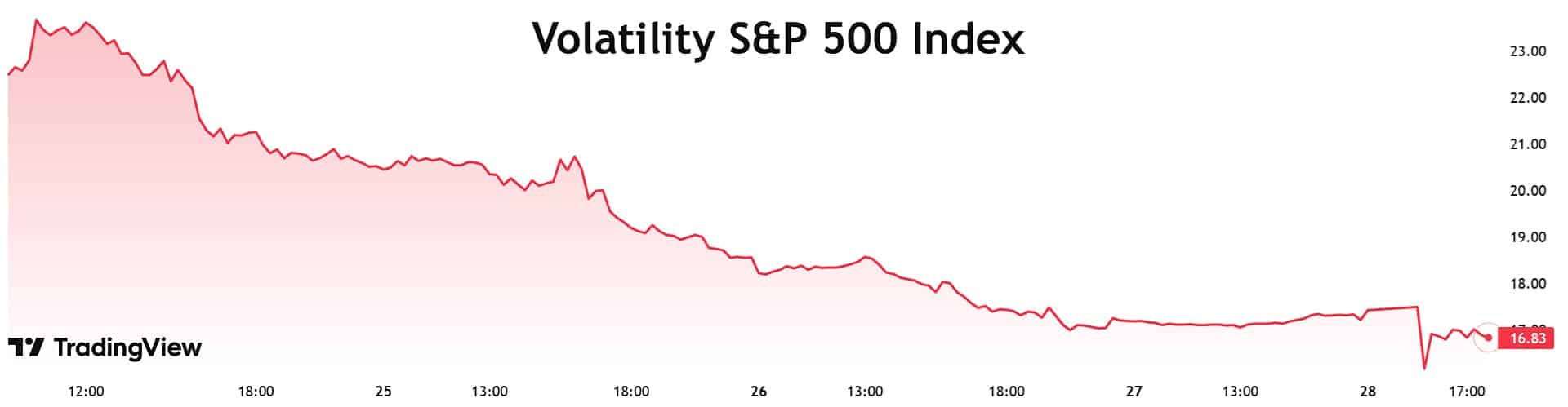 Du côté des actions, le VIX, qui fait office de baromètre de la peur pour le S&P 500, a lui aussi décroché depuis ses plus hauts récents. On assiste donc à une détente synchronisée sur crypto et actions, qui renforce l’impression d’un environnement plus propice aux actifs risqués.