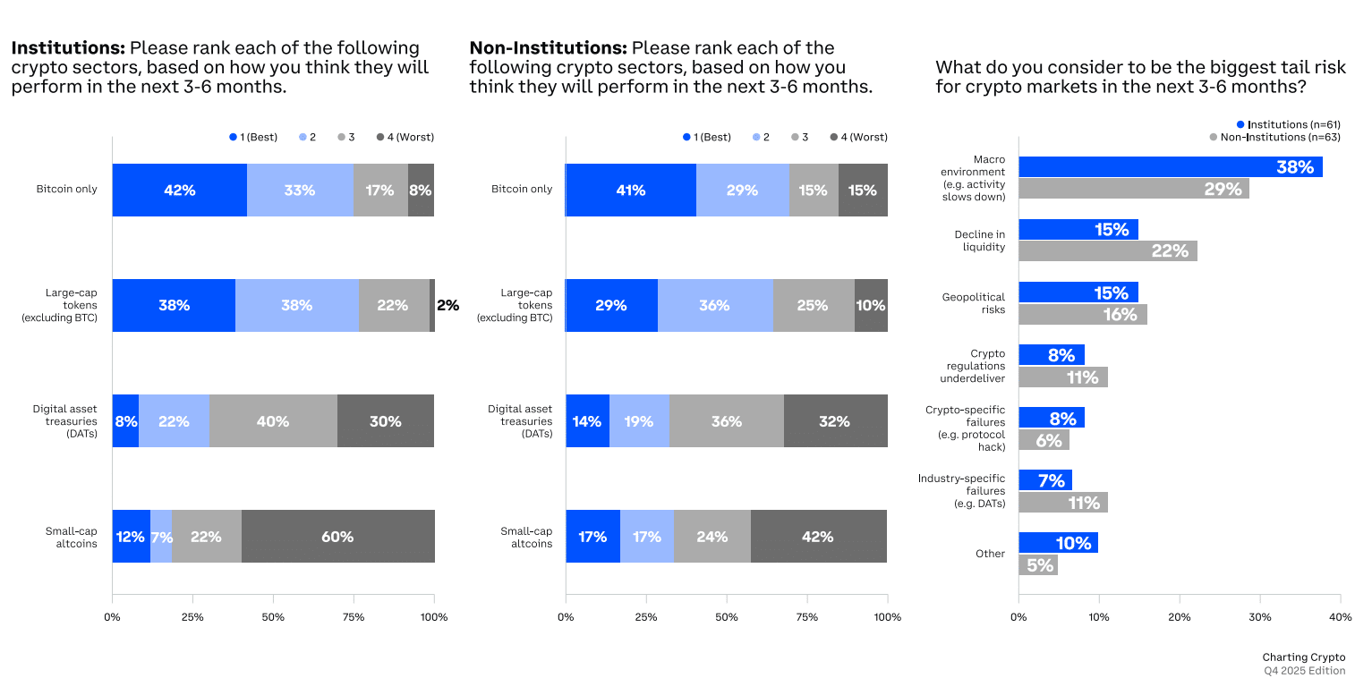Parmi un échantillon de 124 investisseurs institutionnels, une enquête montre des points de vue divergents sur le cycle actuel du marché. En effet, près de 45 % des institutions jugent que le marché des cryptomonnaies se trouve en phase avancée d’un cycle haussier, contre 27 % chez les investisseurs individuels.