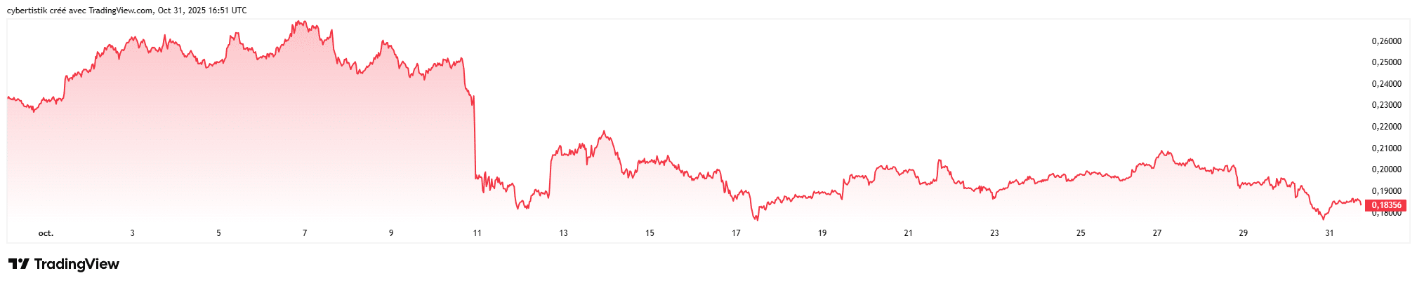D’ailleurs, nous esquissions déjà récemment l’essoufflement de Dogecoin en cette fin octobre. Notre article d’il y a deux jours dresse en effet le décor d’une dynamique déjà fragilisée sous 0,20 $.
