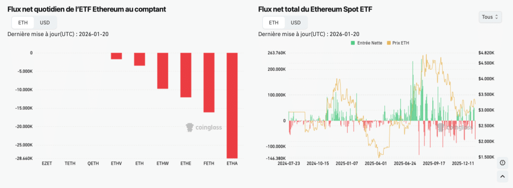 Le premier levier, ce sont les ETF spot Ethereum. Sur la semaine du 12 au 16 janvier 2026, ils ont enregistré environ 479 M$ d’entrées nettes, un record hebdomadaire d’après les données de suivi, portant les entrées cumulées depuis le lancement à 12,9 milliards de dollars. Toutefois, la tendance revient dans le rouge ces derniers jours. Le 20 janvier, ces mêmes ETF ont connu près de 230 millions de dollars de sorties nettes en une séance, mettant fin à une série de cinq jours positifs.