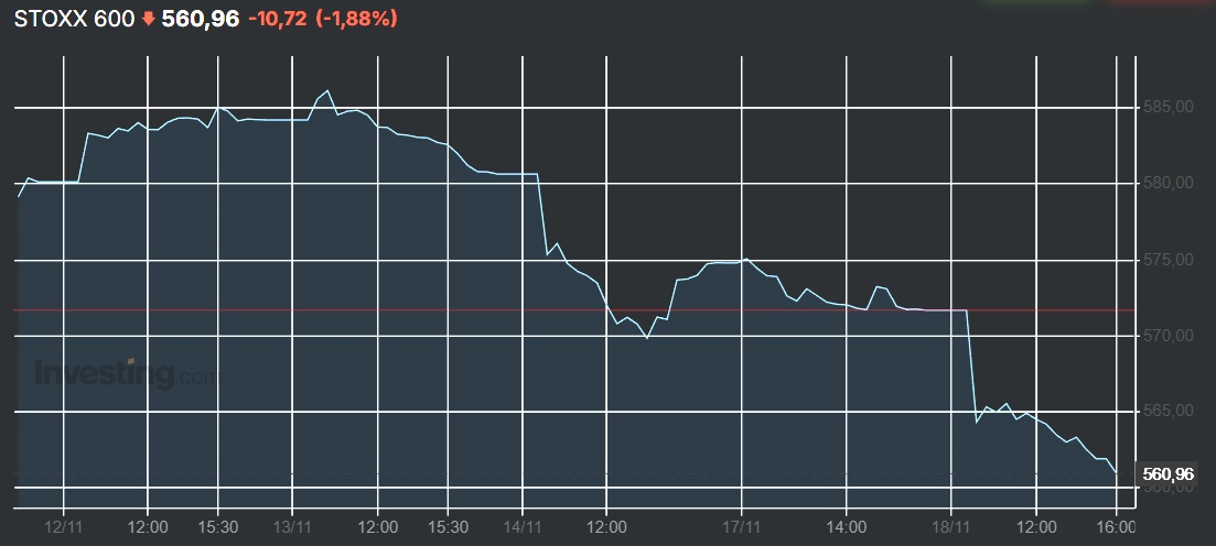 Les actions européennes repartent à la baisse ce mardi, dans un climat de risk-off global. Le STOXX 600 perd un peu plus de 1 %, et on observe des replis marqués à Paris et Francfort.