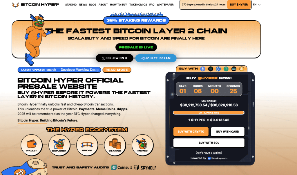 Dans l’ombre des ETF, une autre tendance s’installe : la course aux solutions de mise à l’échelle de Bitcoin. Bitcoin Hyper se présente comme une couche 2 capable d’exécuter des contrats intelligents grâce à une compatibilité avec la Solana Virtual Machine, tout en s’appuyant sur la sécurité du réseau Bitcoin.