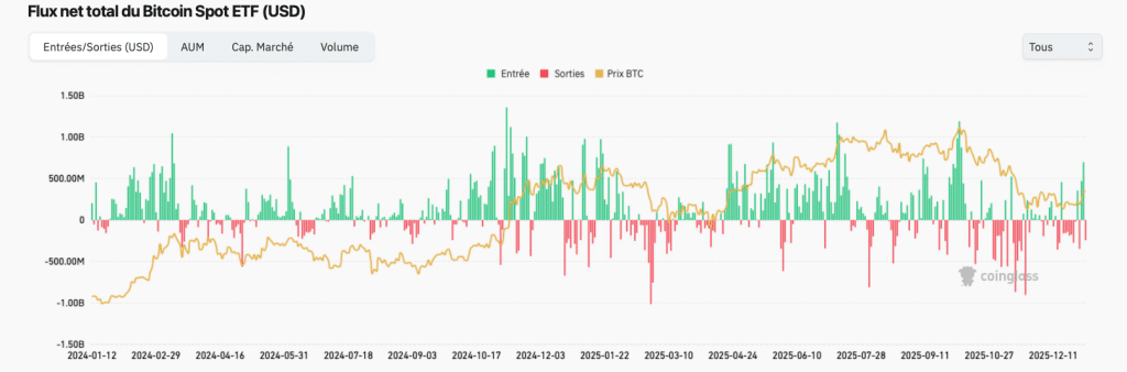 Les chiffres des premiers jours de janvier parlent d’eux-mêmes. Les ETF spot américains ont enregistré +471,3 millions de dollars le 2 janvier, puis +697,2 millions le 5 janvier, avant une séance de respiration à –243,2 millions le 6 janvier. Au total, la collecte cumulée depuis le lancement dépasse 57 milliards de dollars, pour un encours estimé autour de 117 milliards, soit une poche désormais significative de la capitalisation du BTC.