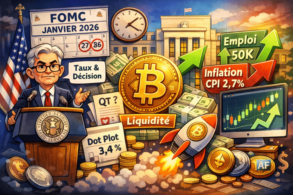 À deux semaines du FOMC des 27-28 janvier 2026, les marchés crypto se recalent sur le scénario de taux américain. La Fed communiquera sa décision le 28 janvier, suivie d’une conférence de presse à 14 h 30 (heure de Washington). Dans ce contexte, le bitcoin évolue autour de 90 000 à 92 000 $ début janvier, un niveau qui traduit une forte sensibilité au moindre changement de « price action » sur les rendements et le dollar. Pour anticiper un rebond, trois signaux méritent une surveillance serrée.