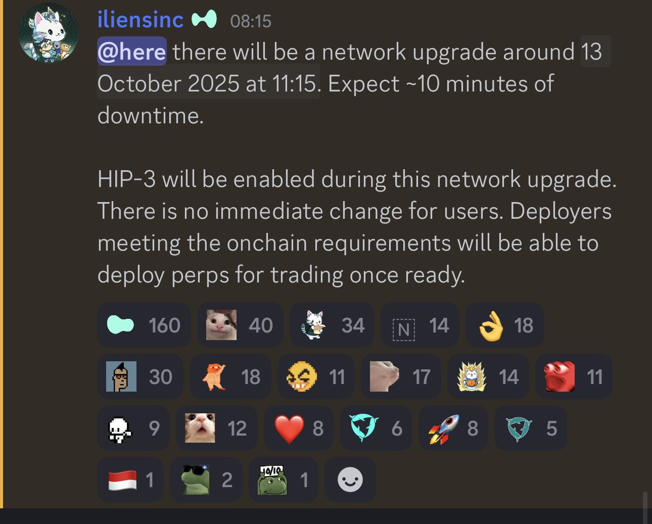 Actuellement, la fonctionnalité est disponible sur le testnet, où la communauté expérimente déjà la création de marchés perpétuels personnalisés. Toutefois, le déploiement officiel sur le réseau principal est désormais imminent. Un message publié sur le serveur Discord d’Hyperliquid a confirmé la sortie du HIP-3 pour le 13 octobre, suscitant une forte attente au sein de la communauté DeFi.