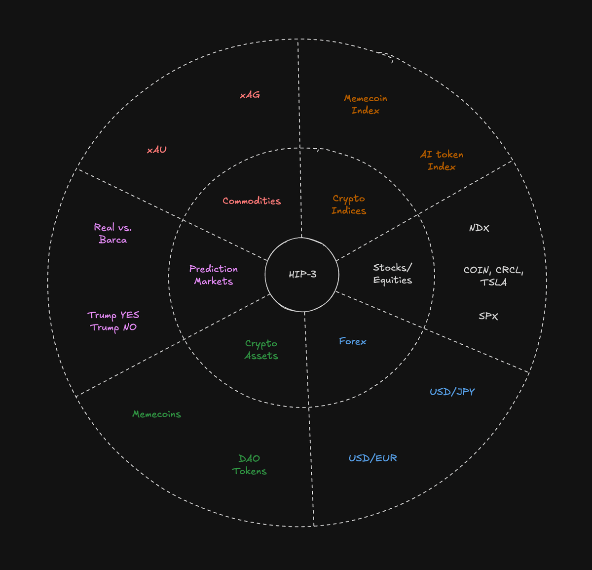Autrement dit, ce HIP-3 ouvrira la possibilité de concevoir des marchés sur quasiment tous types d’actifs : des cryptomonnaies en passant par des actifs du monde réel comme l’indice S&P 500, l’or ou encore des devises, mais aussi des marchés synthétiques sur des actions pré-IPO, jusqu’alors réservées à certaines stratégies d’institutions financières seulement.