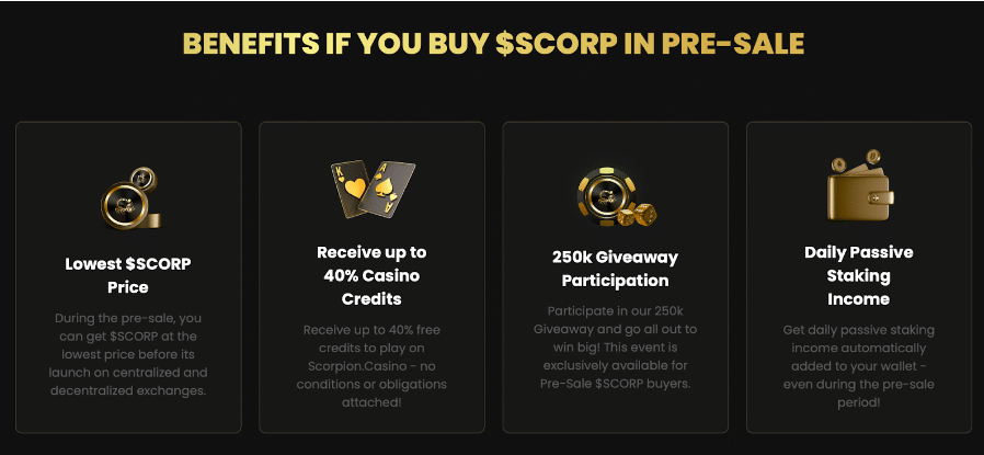 Vous pouvez commencer à gagner un revenu passif grâce aux jetons Scorpion Casino dès la phase de prévente. La cryptomonnaie de staking est actuellement en vente à des prix fortement réduits lors de la prévente officielle, qui se rapproche rapidement d’une clôture anticipée en raison de la demande croissante. Il s’agit d’un excellent investissement à court et à long terme en raison de l’élan croissant du projet, ainsi que de la diversité des offres de la plateforme.