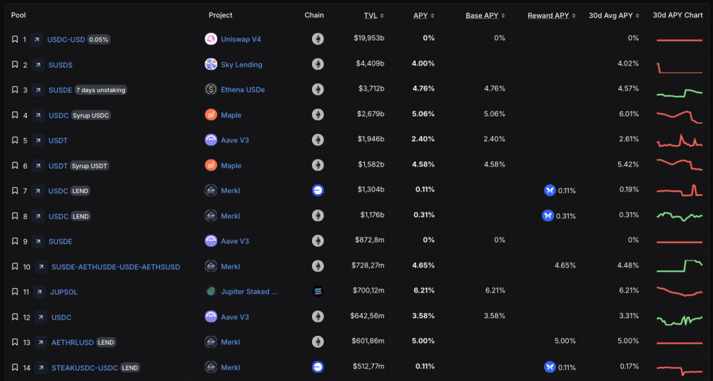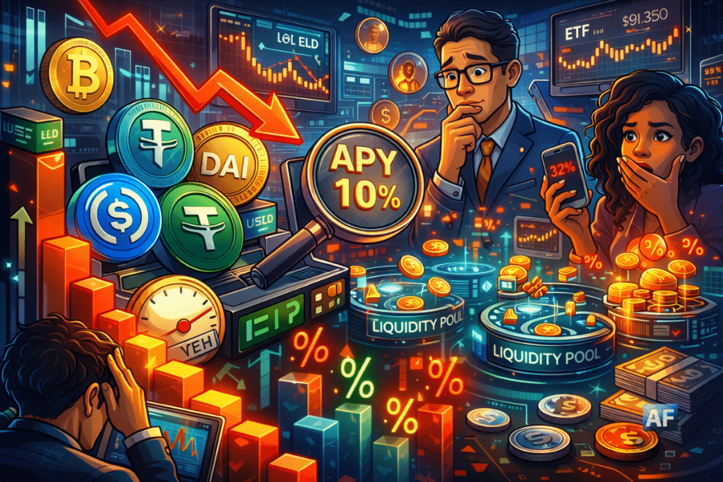 Depuis quelques semaines, un sujet revient dans toutes les discussions DeFi : les rendements sur les stablecoins se « décompressent ». Là où l’on trouvait facilement des APY à deux chiffres (souvent dopés par des incentives), beaucoup de pools reviennent vers des niveaux bien plus ordinaires. Et ce n’est pas juste un détail pour les chasseurs de yield : c’est un véritable baromètre de la demande de levier, du niveau de risque accepté et de la santé globale du crédit on-chain.