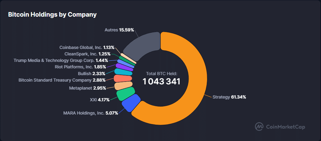 Pour sa part, Strategy reste aujourd’hui le plus grand détenteur institutionnel de Bitcoin au monde. À ce jour, l’entreprise possède environ 2,5 % de l’offre totale en circulation. De plus, elle détient à elle seule davantage de Bitcoin (BTC) que les réserves combinées des quinze plus grands mineurs et sociétés cotées exposées à la cryptomonnaie.
