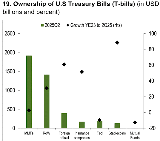 D’après les dernières analyses de la BRI et de la BCE, les principaux stablecoins affichent une capitalisation boursière proche des 280 milliards de dollars, dont près de 90 % sont concentrés chez deux émetteurs. Ces acteurs ont d’ailleurs accumulé des volumes d’obligations du Trésor comparables à ceux des grands fonds monétaires.