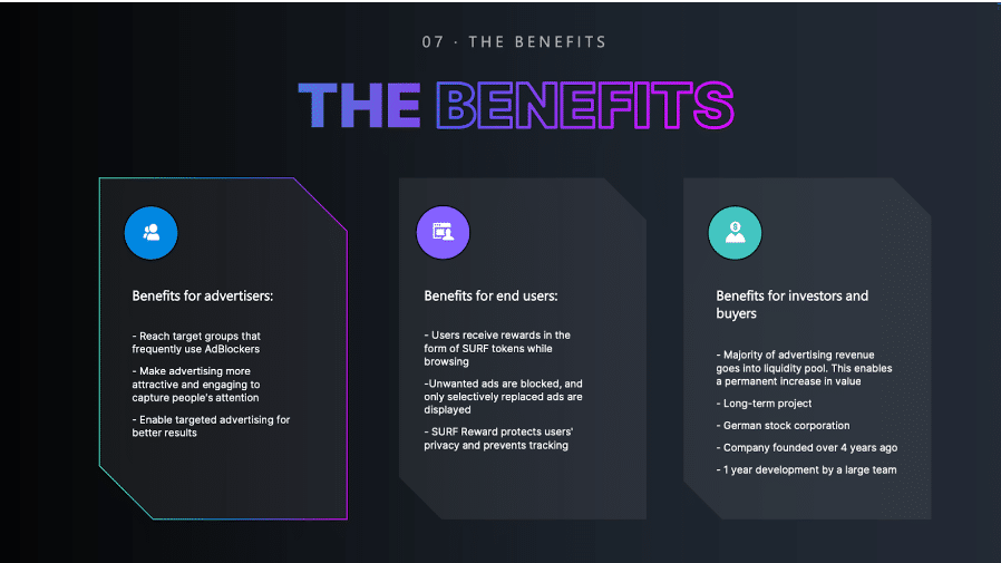 L’engouement de la prévente autour de Surf Reward s’explique au mieux par son projet sous-jacent et son potentiel de croissance. La pertinence de Surf Reward sur le marché ne se limite pas au marché des crypto-monnaies, contrairement à la plupart des projets Web3. Il a une grande pertinence dans le monde réel. Surf Reward lance un projet qui sera utile à des personnes du monde entier – un bloqueur de publicités qui vous permet de gagner de l’argent en regardant des publicités.