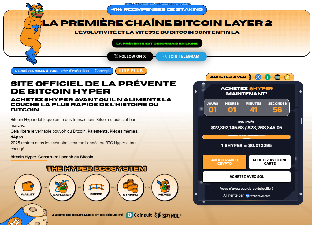 Bitcoin Hyper continue d’attirer l’attention à un moment où l’environnement est marqué par une certaine prudence. Le projet repose sur le Solana SVM que l’on pourrait qualifier de couche 2, permettant d’exécuter des contrats intelligents/de dApps DeFi/NFTs, tout en bénéficiant des avantages en matière de sécurité/environnement Bitcoin.