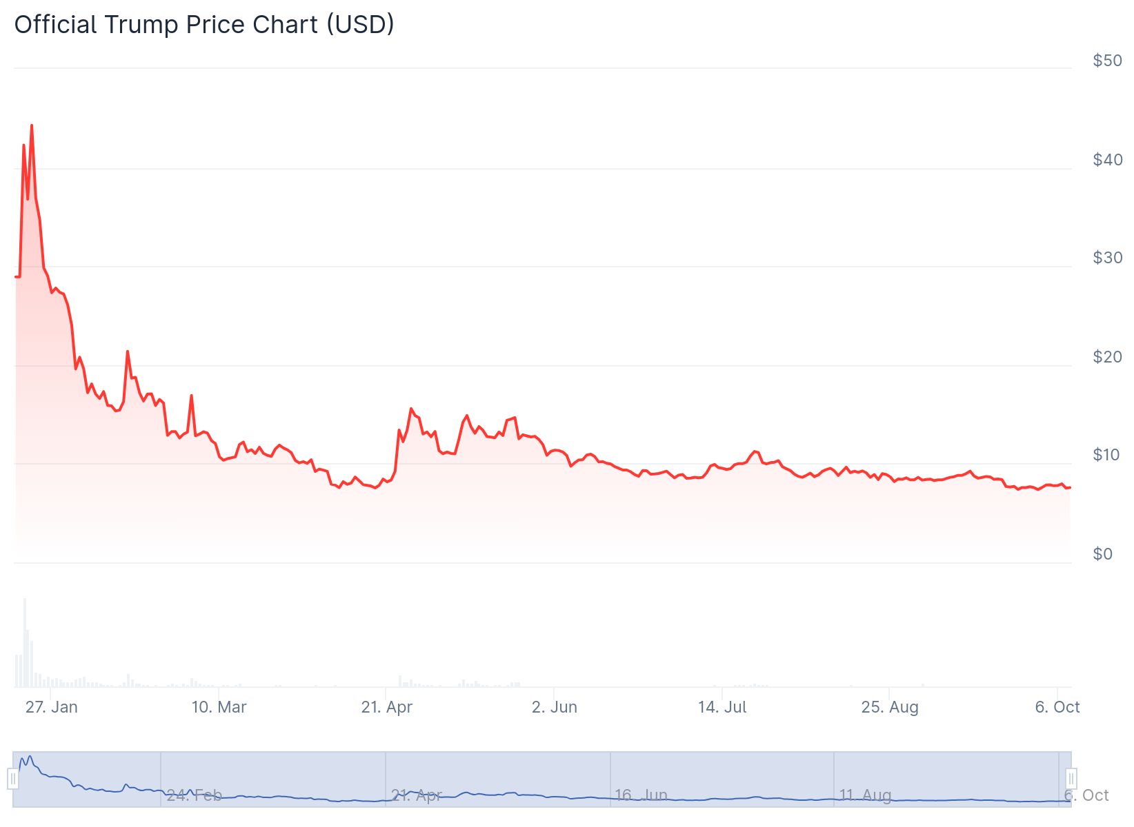 Le 8 octobre dernier, le prix du jeton TRUMP était d’environ 44 dollars en janvier 2025, alors qu’il ne vaut plus que 7,57 dollars, soit un investissement qui a perdu plus de 80 % de sa valeur. Le marché estime le jeton à près de 1,5 milliard de dollars, mais seulement 35 % de l’offre, 800 millions de jetons, est en circulation, le reste étant bloqué depuis le lancement du projet.