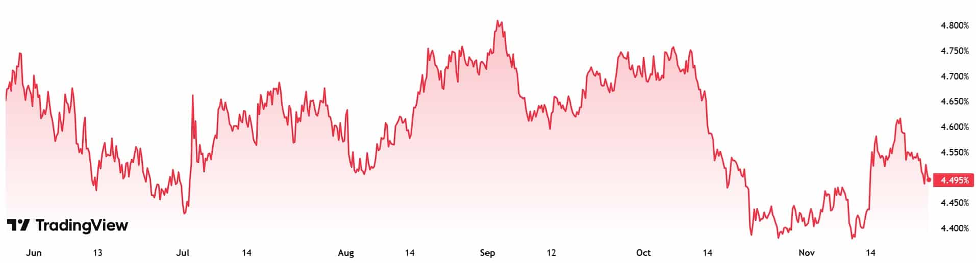 Portés par la perspective d’une nouvelle baisse de taux de la Fed en décembre, les rendements des Treasuries se replient depuis quelques séances. Un mouvement qui, mécaniquement, les gilts britanniques à la baisse dans son sillage. Le rendement du gilt à 10 ans est ainsi revenu vers 4,5 %, après un pic proche à 4,6 % mi-novembre. Dans le même temps, le Treasury 10 ans américain oscille autour de 4 %.