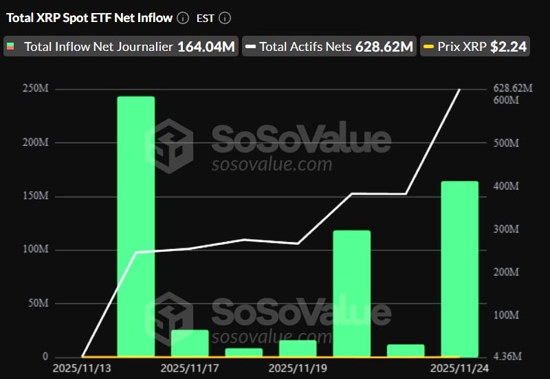 Ainsi, les premières données de flux disponibles évoquent plus de 150 à 160 M$ d’entrées cumulées pour les ETF XRP en seulement quelques séances. Un niveau qui contraste avec les sorties observées ces derniers jours sur une partie des ETF Bitcoin ou Ether.