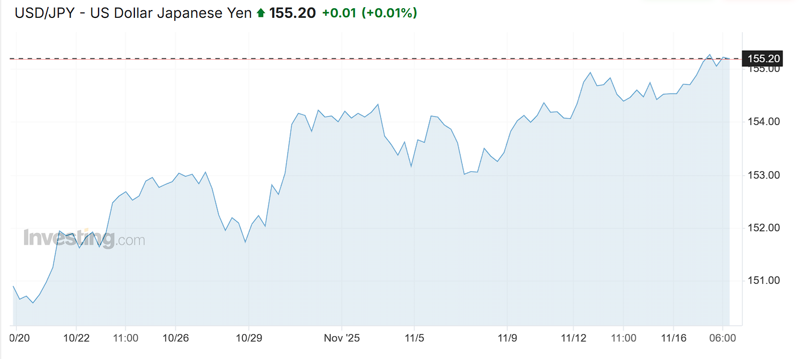 La paire dollar/yen a brièvement dépassé 155 avant de refluer légèrement, signalant le début d’une phase de prise de bénéfices. Si le mouvement reste modeste, il traduit toutefois un inconfort croissant face aux niveaux atteints.