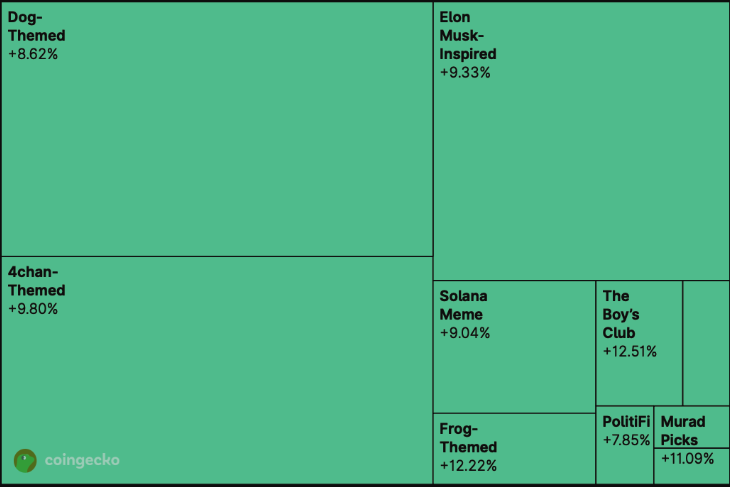 Cette semaine, les projets à l’effigie de grenouilles dominent largement les échanges. Pepe (PEPE) s’impose comme la vedette du moment avec une hausse à deux chiffres en seulement 24 heures. Les paris à forte conviction de Murad suivent de près, notamment SPX6900, tandis que les poids lourds à thème canin, comme DOGE, enregistrent également de solides performances.