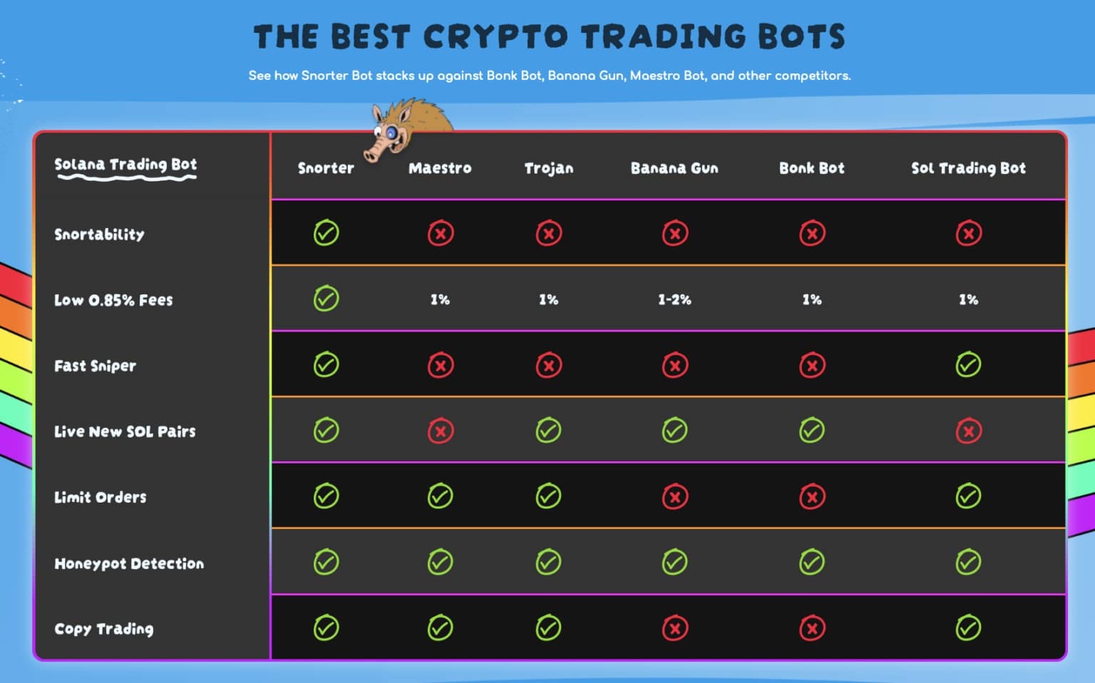 Aucun autre projet ne progresse aussi vite que Snorter en ce moment. La vitesse de Solana, combinée à une portée multichaîne, crée un avantage compétitif net. Les frais de transaction comptent parmi les plus bas du marché.