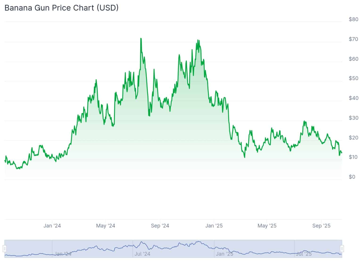 Banana Gun a débuté avec environ 1,2 million de dollars levés en tour privé. La capitalisation a ensuite bondi jusqu’à 276 millions de dollars à son apogée. Ce parcours est égal à une augmentation x230 par rapport à la valeur initiale du projet.