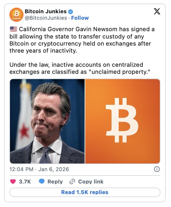 Signée par le gouverneur Gavin Newsom, la loi DFAL et la mise à jour SB 822 établissent un mandat important : si le Bitcoin (BTC) ou d’autres actifs numériques restent dormants pendant trois ans sans « acte de propriété », ils sont légalement considérés comme « abandonnés ».
