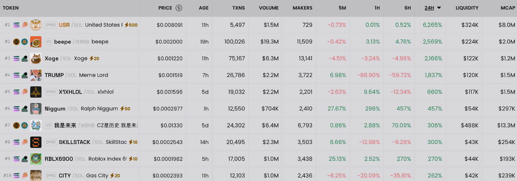 Parmi les dix tokens les plus suivis du moment, quatre sont des meme coins issus de Solana. Xoge (XOGE) enregistre une envolée de 2 569 %, tandis que Meme Lord (TRUMP) progresse de 1 837 %. Hors de Solana, Beepe (BEEPE), déployé sur la BNB Chain, affiche lui aussi une hausse de 2 569 %.