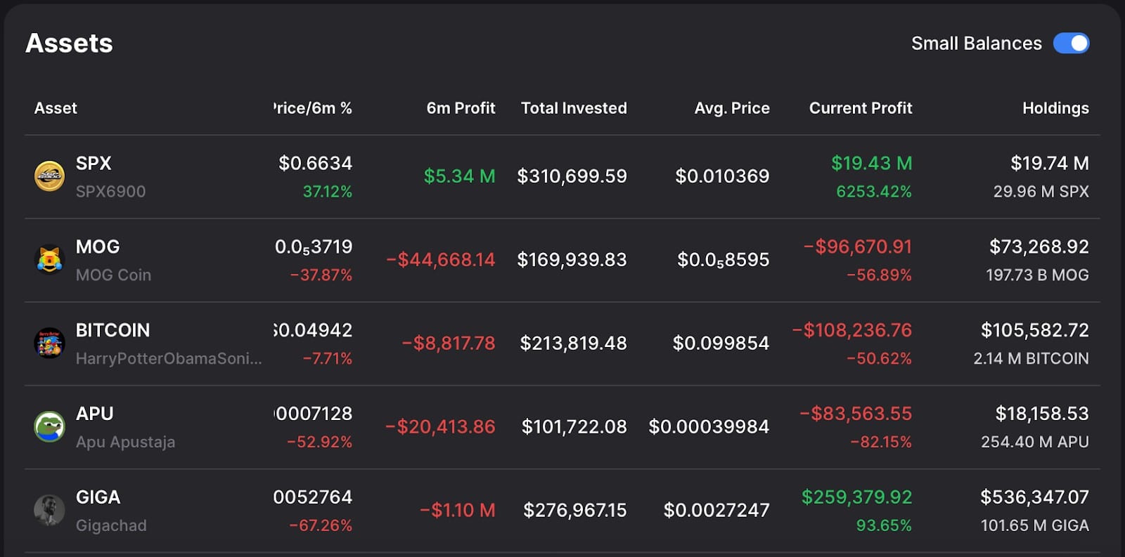Murad comprend mieux que quiconque les fondamentaux cachés des memecoins. Son investissement initial de 310 000 $ vaut désormais près de 20 millions. Un seul jeton lui a rapporté 19,7 millions de dollars en quelques mois. SPX et GigaChad ont propulsé son portefeuille parmi les plus enviés du secteur. Même si certains paris ont faibli, ses gros coups restent spectaculaires.