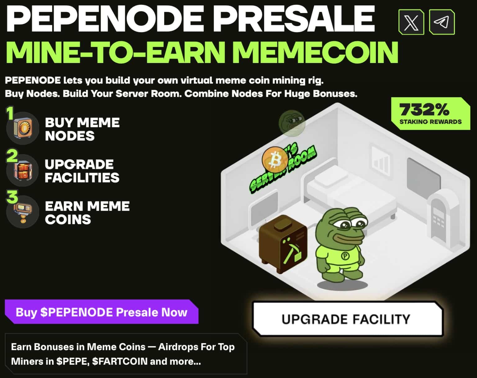 Une façon de générer du PEPE passivement au lieu d’attendre simplement sa hausse. Premier memecoin mine-to-earn de son genre, PepeNode transforme le minage en jeu de stratégie virtuel. Les utilisateurs peuvent générer des actifs majeurs comme PEPE, Fartcoin (FARTCOIN) et d’autres via le gameplay.