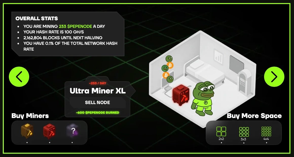 PepeNode élimine les contraintes matérielles et plonge les joueurs dans un serveur virtuel. Chaque joueur est doté d’une salle vide qu’il doit transformer en un empire de minage crypto. L’optimisation et le rangement de ces ressources sont au cœur de la stratégie. Et vu qu’il n’y a pas de facture d’électricité, ils possèdent simplement une interface et des choix à la fois ludiques et tactiques.