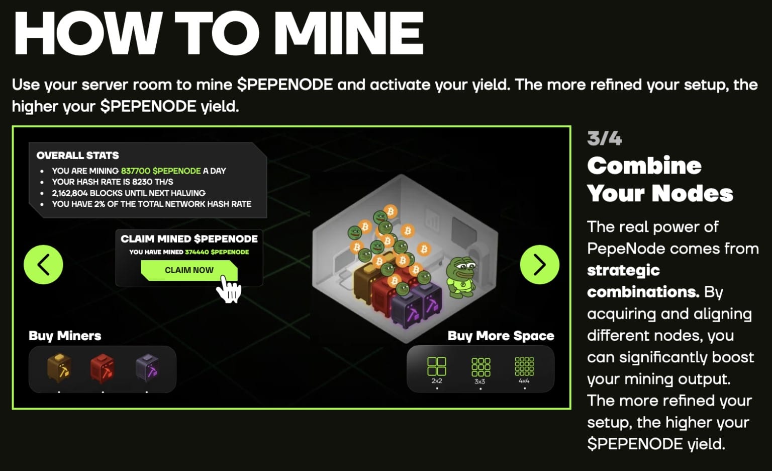 L’objectif de PepeNode va bien au-delà du simple jeu sur blockchain. L’écosystème englobe une logique économique entièrement interconnectée et complète. Stratégie, performance et processus déflationnistes s’entrelacent dans une expérience unifiée. Les utilisateurs personnalisent leur salle d’extraction virtuelle en fonction de leurs goûts. Il est possible d’acquérir et d’associer divers nœuds présentant des caractéristiques distinctes. Le but est toujours évident : optimiser la production de crypto-monnaies.