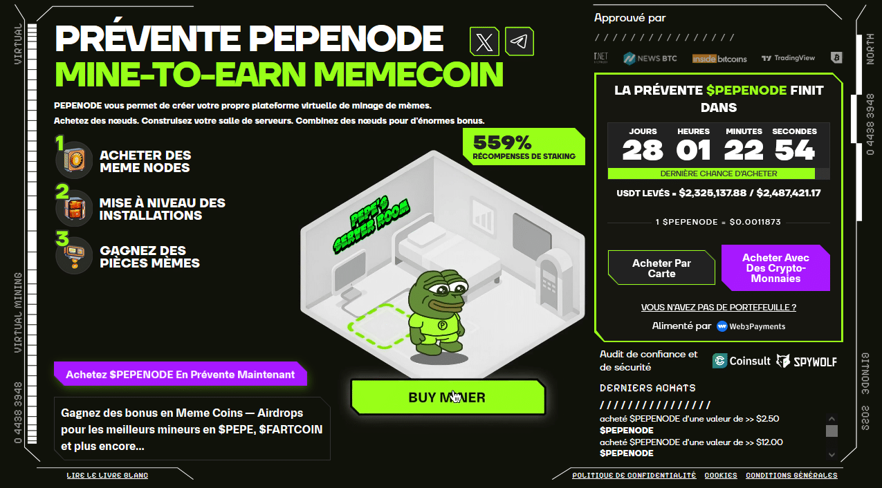 PepeNode (PEPENODE), présenté comme le premier jeu mine-to-earn mêlant humour de memecoins et mécanismes de minage virtuel, s’apprête à fermer l’accès anticipé à son token PEPENODE. Ce jeton constitue la ressource essentielle permettant aux joueurs d’assembler leurs propres rigs de minage numériques et d’accumuler des récompenses.