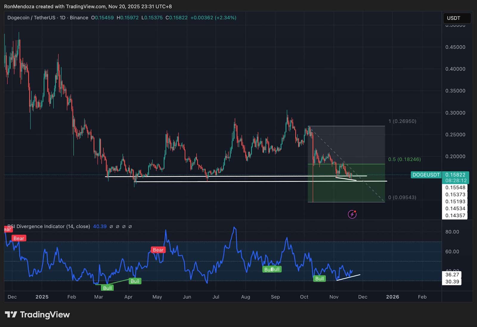 Son rival direct SHIB évolue aussi sur un seuil clé. Les experts notent une divergence haussière du RSI. Le prix baisse alors que l’indicateur monte. Ce signal technique indique un épuisement vendeur.