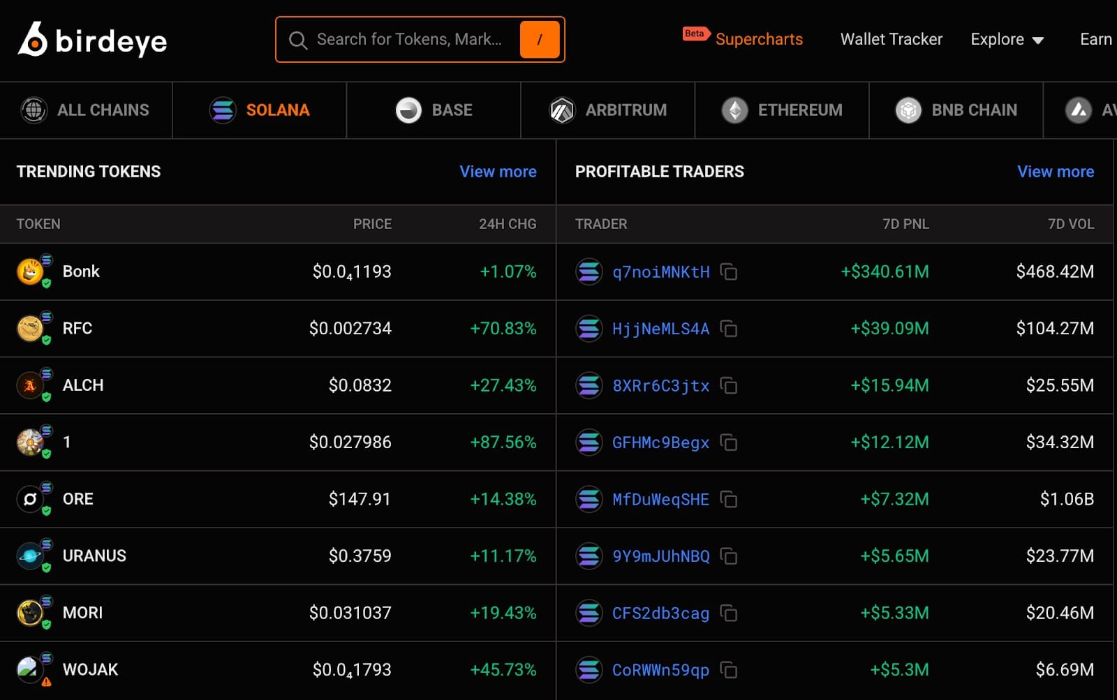 Les traders utilisent Birdeye.so pour suivre les wallets actifs sur les memecoins Solana. La table “profitable traders” est devenue incontournable pour les day traders expérimentés. Mais l’accès complet est payant, ce qui limite l’analyse pour les petits portefeuilles. Seuls les dix wallets les plus visibles sont gratuits, souvent avec des signaux d’alerte.