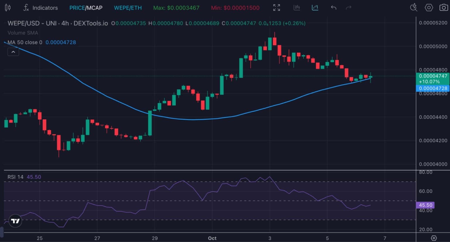 WEPE, avec près de 60 000 abonnés sur X, voit ses indicateurs techniques s’aligner favorablement. Ils convergent avec les nouvelles haussières du jour. Sur le graphique 4 heures, le prix est soutenu par la moyenne mobile à 50 jours.