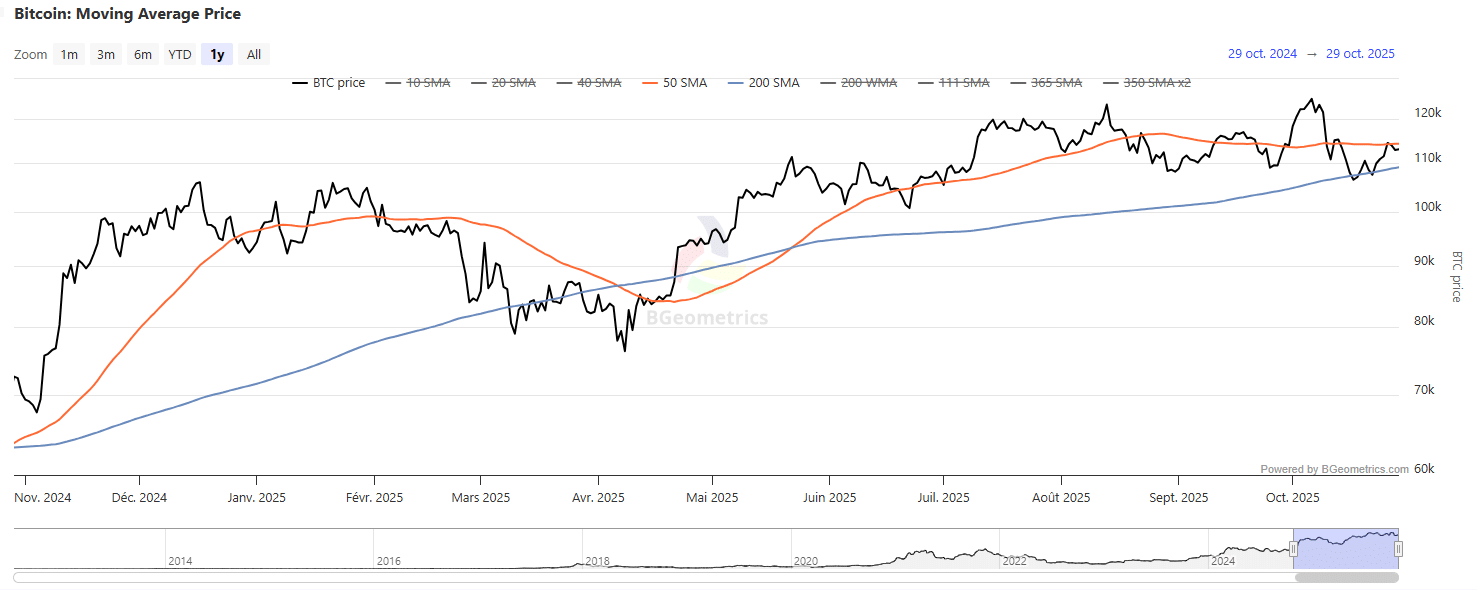 Les indicateurs techniques demeurent généralement favorables : le Bitcoin est toujours au-dessus de ses moyennes mobiles sur 50 et 200 jours, un seuil fréquemment perçu comme un indice de robustesse du marché.