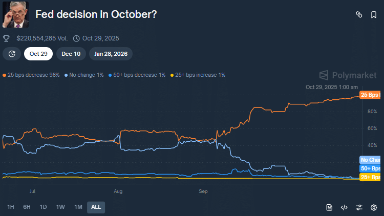Le FOMC (Federal Open Market Committee) se réunit ces 28 et 29 octobre, un rendez-vous très attendu par les marchés. D’après les chiffres observés sur Polymarket, une majorité d’analystes s’attend à une nouvelle baisse de 25 points de base du taux directeur (bps). Ainsi, le taux pivot glisserait ainsi dans une zone comprise entre 4,00 % et 4,25 %, signe que la Fed poursuit doucement son virage accommodant. Cette perspective incite les fonds spécialisés en cryptomonnaies à rester prudents, alors que la Réserve fédérale maintient une ligne monétaire jugée encore stricte.
