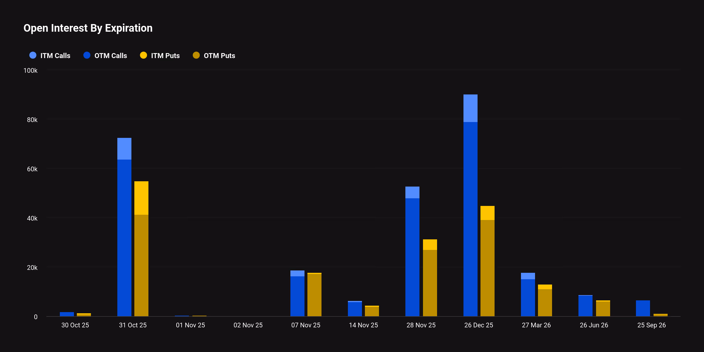 Ces options représentent 14,4 milliards de dollars de valeur notionnelle pour le Bitcoin (72 716 calls et 54 945 puts) et 2,6 milliards de dollars pour Ethereum. En revanche, environ 82,5 % des positions ouvertes sont aujourd’hui hors de la monnaie (OTM), ce qui montre que les opérateurs anticipent encore des mouvements de prix importants.
