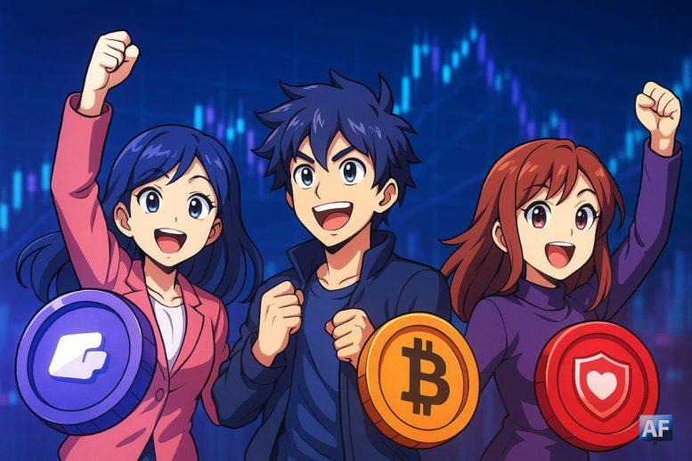 Illustration manga du marché crypto en baisse avec Bitcoin, Ethereum et XRP sur un graphique rouge.