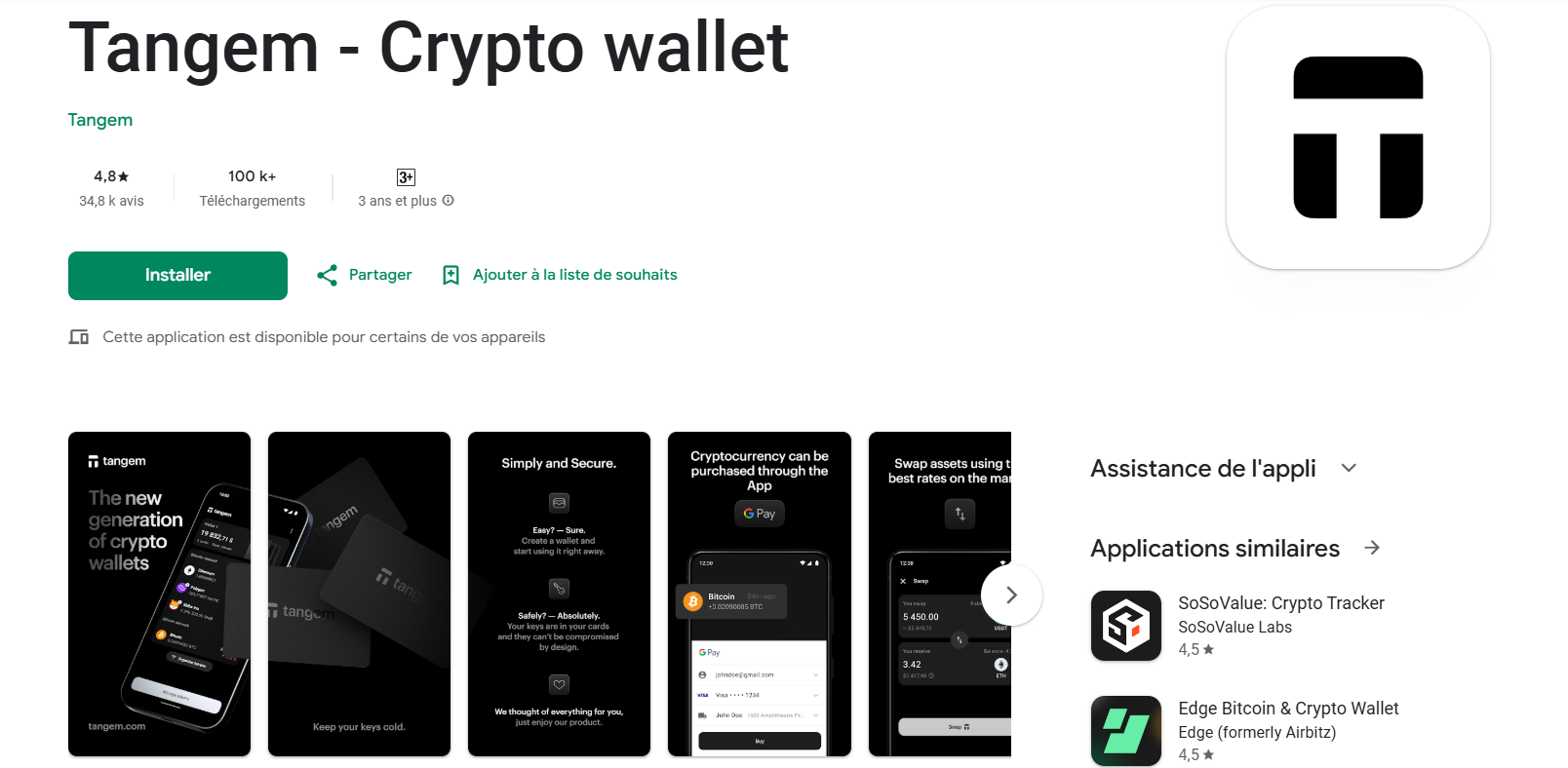 | Critères | Tangem wallet | Ledger Nano S/X | Trust Wallet |